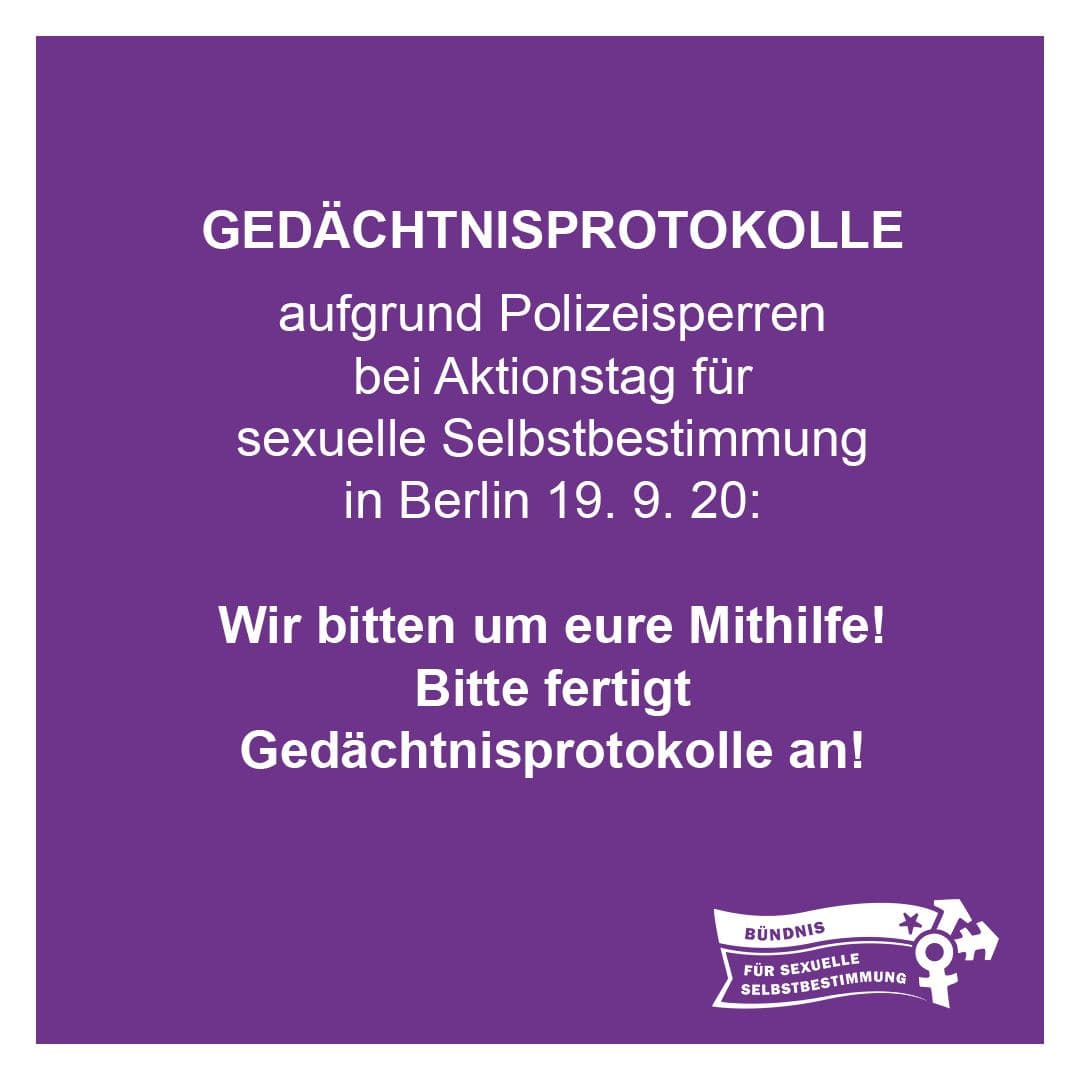 Gedächtnisprotokolle aufgrund Polizeisperren bei Aktionstag für sexuelle Selbstbestimmung in Berlin 19. 9. 20: Wir bitten um eure Mithilfe! Bitte fertigt Gedächtnisprotokolle an!