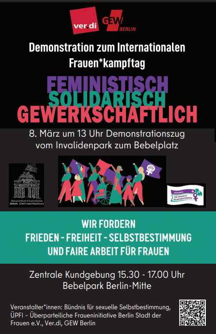 Seit einigen Jahren haben wir in Berlin der Internationale Frauentag als Feiertag. Leider hat Corona in den letzten 3 Jahren größere Veranstaltungen, auf denen all die Probleme aufgezeigt werden, die das Leben von Frauen auch heute noch beeinträchtigen und, wo die Gleichstellung der Geschlechter noch nicht funktioniert. In diesem Jahr wollen wir auf einer zentralen Veranstaltung in der Zeit 13.00 bis 17.00 Uhr Frauen *, die mit den herrschenden Verhältnissen nicht einverstanden sind, versammeln und viele von ihnen auch zu Wort kommen lassen (max. 3 min), um über ihre Erfahrungen und Ängste sowie über Ideen und Vorstellungen für einen gerechtere Gesellschaft zu sprechen.